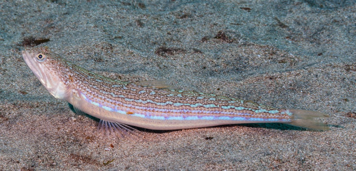 Indeed, their head and body shape resemble reptiles. In contrast to venomous weevers, lizardfishes are absolutely harmless. They can be up to 40 centimeters long, but fish up to 20-25 centimeters long are more common.