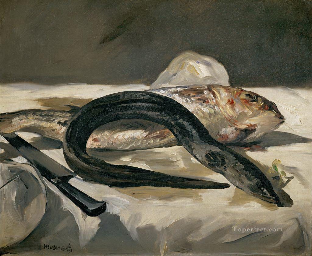 (Fragment of the painting by Edouard Manet “Eel and Red Mullet”. 1863 year.)
