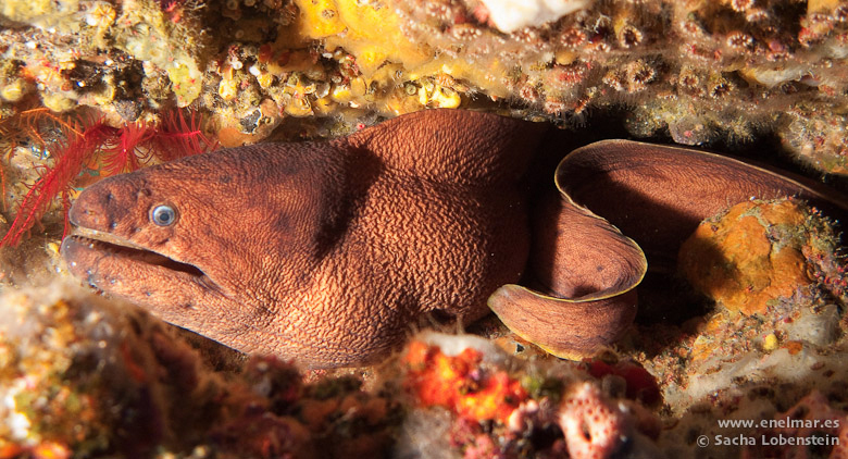 Fish of the Gymnothorax genus of the Muraeninae subfamily of the Muraenidae (moray eels) family of the Anguilloidei suborder of the Anguilliformes (eels) order of the Elopomorpha superorder. (Brown moray. Photo by © Sacha Lobenstein. enelmar.es) Brown moray (Gymnothorax unicolor) was first described in 1809 by the French botanist and ichthyologist…
